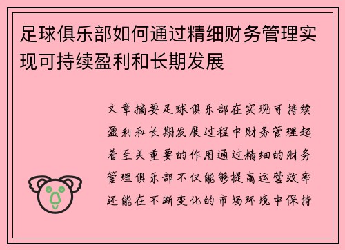 文章摘要:足球俱乐部的财务管理是保证俱乐部可持续发展的核心要素之一。随着现代足球产业化进程的不断加快,俱乐部面临着越来越复杂的财务挑战。本文将从四个方面详细探讨足球俱乐部财务管理的核心策略与优化路径:一是收入结构的优化与多元化,二是成本控制与财务风险的管理,三是财务透明度与资金监管的提升,四是财务战...